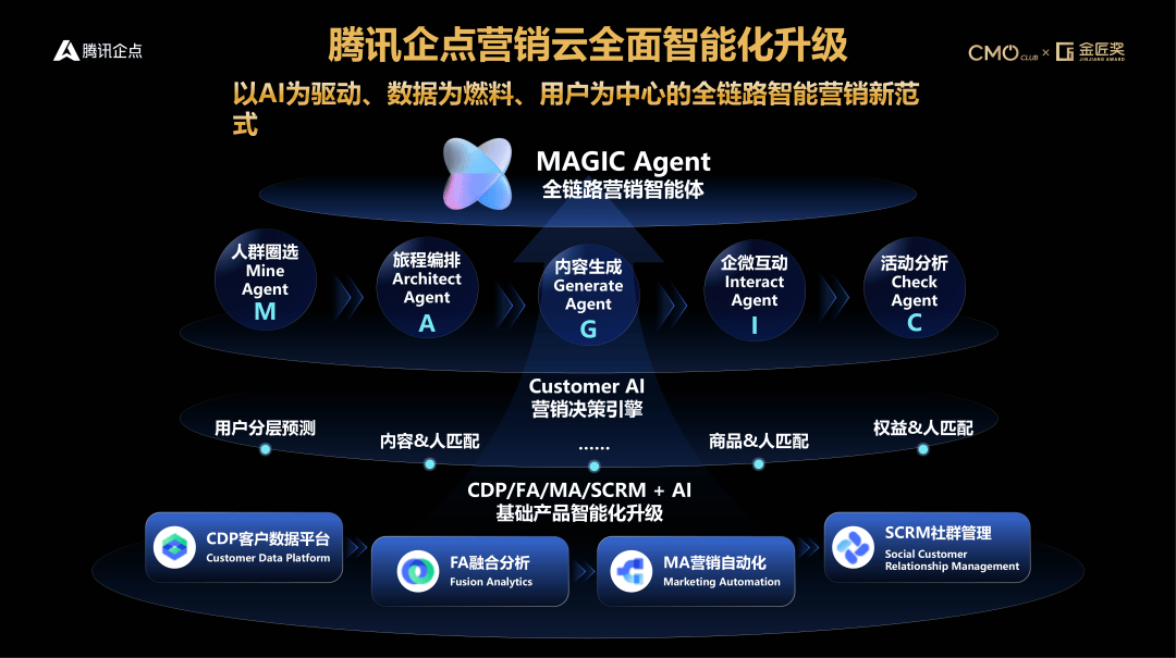 二、企业营销正从保守营销云1。0 向智能营销云2。0 转型,腾讯企点营销云建立以AI 为驱动、数据为燃料、用户为核心的全链智能营销范式,焦点是MAGIC 增加方取全链营销智能体。产物升级聚焦三大标的目的:一是根本东西智能化,含智能分群、辅帮画布生成等场景;二是营销决策引擎,通过大模子+ 机械进修实现用户分层预测、人货场/ 内容/ 权益婚配及AIGC内容生成;三是MAGIC Agent 多Agent 系统,笼盖人群圈选、路程编排等全营业环节,帮力运营人员高效完成复杂营销勾当。