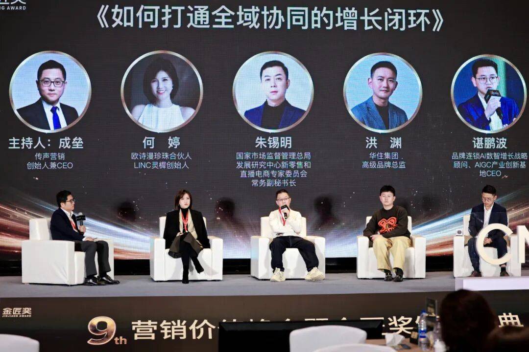 传声营销创始人兼CEO成垒、欧诗漫珍珠合股人&LINC 灵樨创始人何婷、国度市场监视办理总局成长研究核心新零售和曲播电商专家委员会常务副秘书长朱锡明、华住集团高级品牌总监洪渊、品牌连锁 Al 数智増长计谋参谋AIGC 财产立异 CEO谌鹏波。